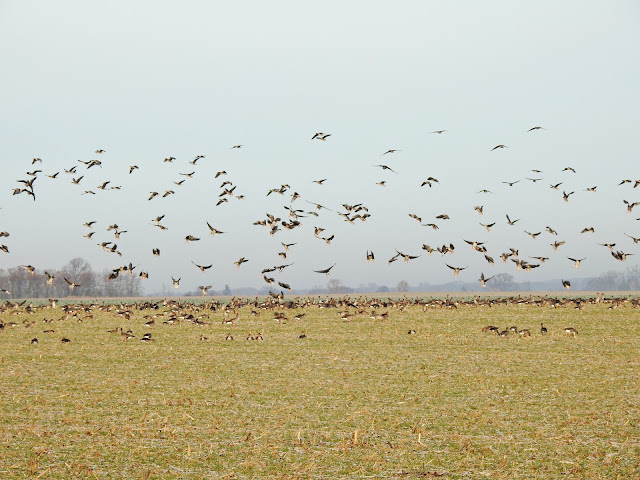 (tu ujęte są wszystkie sfotografowane przeze mnie bernikle białolice - to te ptaki z białymi brzuchami, czarnymi kołnierzami i białymi głowami; trzy z nich są pięknie widoczne na dole zdjęcia, natomiast czwarta bardziej "wtapia się" w inne gęsi i na zdjęciu jest wyżej - druga od lewej)