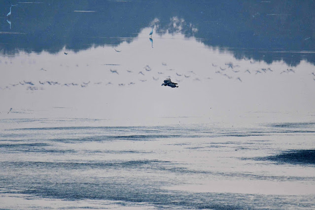 Jak można się domyślić, obecne były również bieliki, co najmniej siedem osobników. Ptaki z jaśniejszymi głowami to osobniki dorosłe, a te z ciemniejszymi - młodociane. Poniżej fotki z obserwacji bielików, jeden "młodzik" właśnie nadlatuje; krewniacy już na niego czekają: